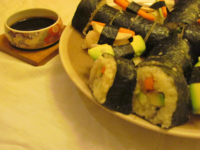 אם נשאר לכם אורז ואצות, כמו שלי נשאר, אפשר לעשות כדורי אורז דחוסים, עליהם לשים פרוסות מרצועות הירקות, ולסגור עם חתיכה ארוכה ודקה של דפי נורי. רק לא לשכוח להדביק את אצת הנורי לעצמה עם מים.